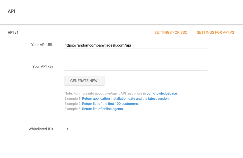 - Para obter a chave API, abra o LiveAgent e vá para Configuração> API e selecione CONFIGURAÇÕES PARA API V1 no canto superior direito. Gere uma chave, copie-a e cole-a na seção de configuração do LiveAgent no Post Affiliate Pro.