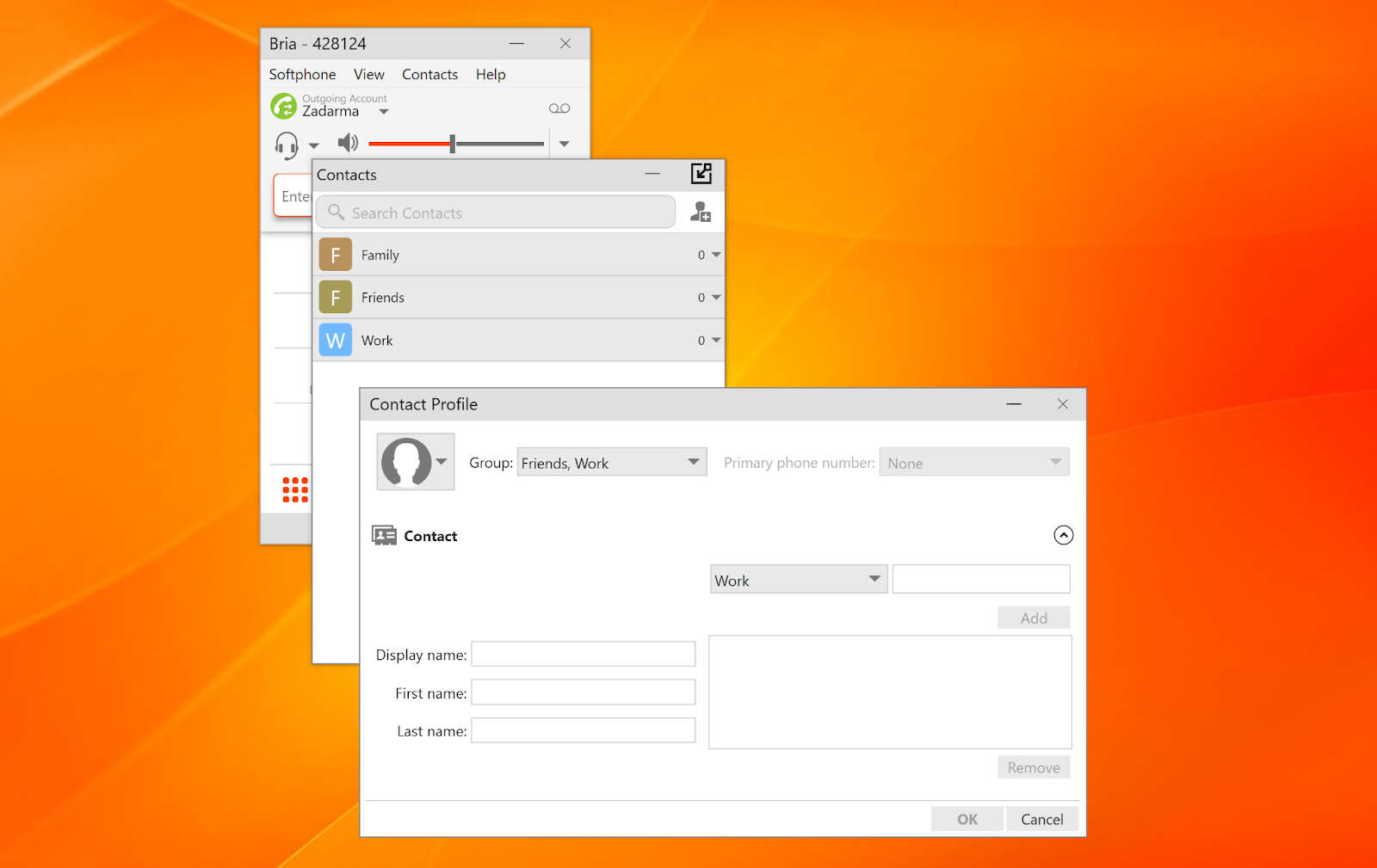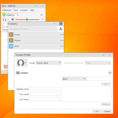 A criação de um novo contato oferece algumas opções: nome de exibição, nome, sobrenome e um campo para salvar números e endereços: um número de softphone, número do trabalho, número residencial, endereço de e-mail, site e a opção “Outros” onde os usuários podem inserir dados personalizados. Não há opção que permita aos usuários escrever um comentário ou uma simples nota nos detalhes do contato, o que é outra desvantagem da lista de contatos do Bria.