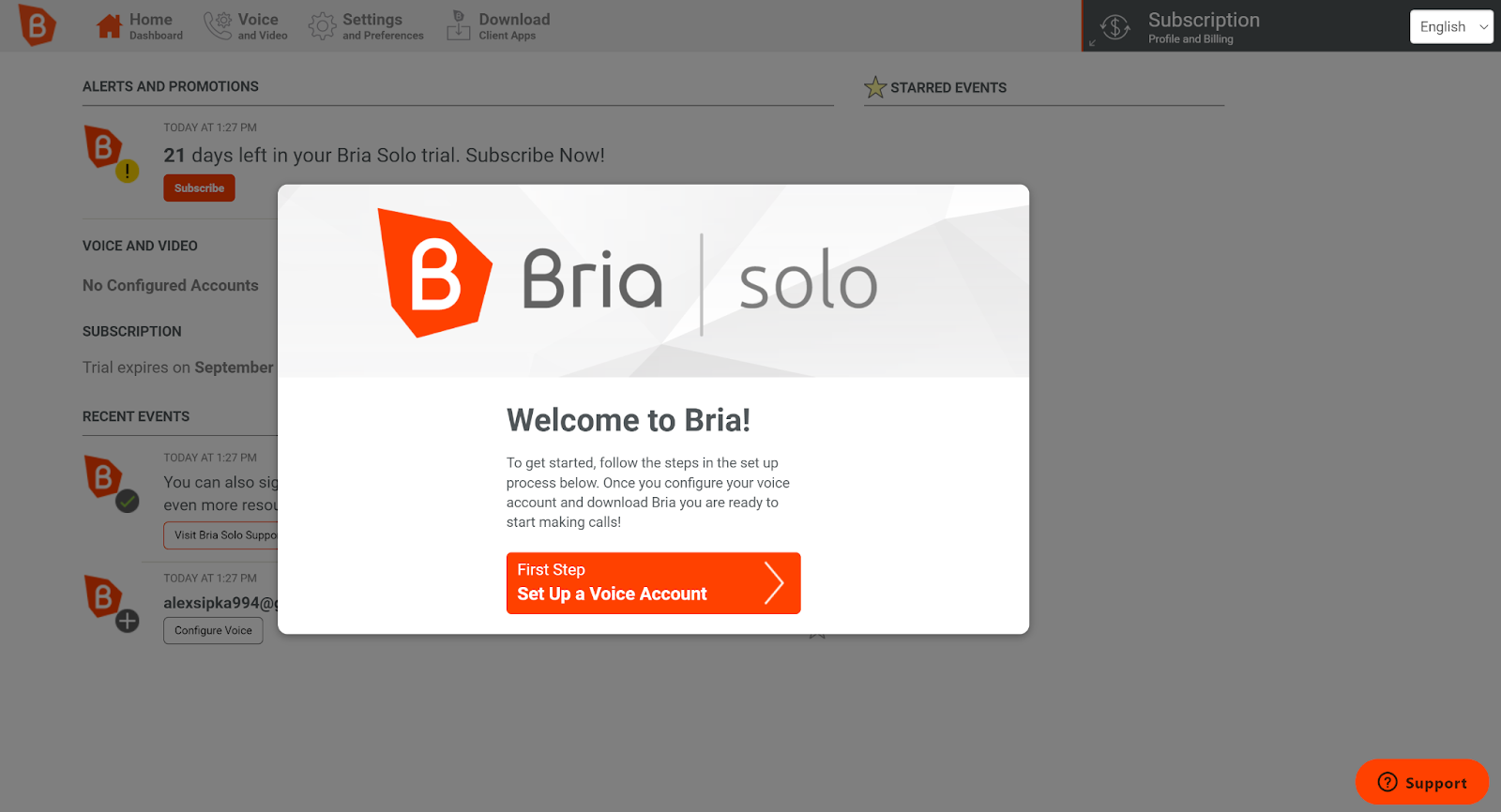 O processo começa com a criação de uma nova conta no site de Bria. Comecei fazendo uma versão de teste primeiro. Selecionei o estudo Bria Solo para o propósito desta revisão. Leva apenas alguns minutos para ser concluído e o site não me obrigou a selecionar nenhum método de pagamento ou adicionar informações de cartão de crédito. Depois de fornecer meus dados, fui recebido em minha conta com uma mensagem simples informando o que fazer a seguir.