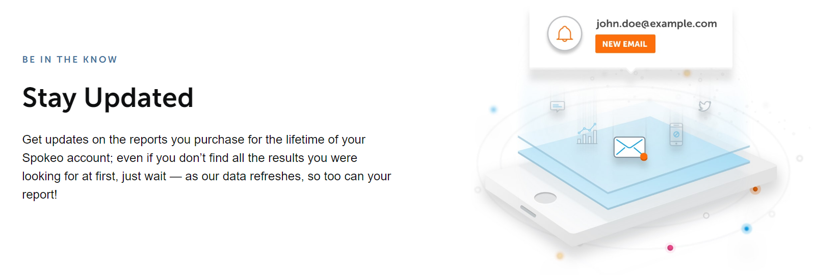 O Spokeo fornece atualizações sobre os relatórios que você comprou anteriormente, para que você sempre tenha acesso às informações mais atuais. Mesmo que o banco de dados não tenha encontrado resultados no momento da sua pesquisa, você poderá ver as novas informações e relatórios após uma atualização.