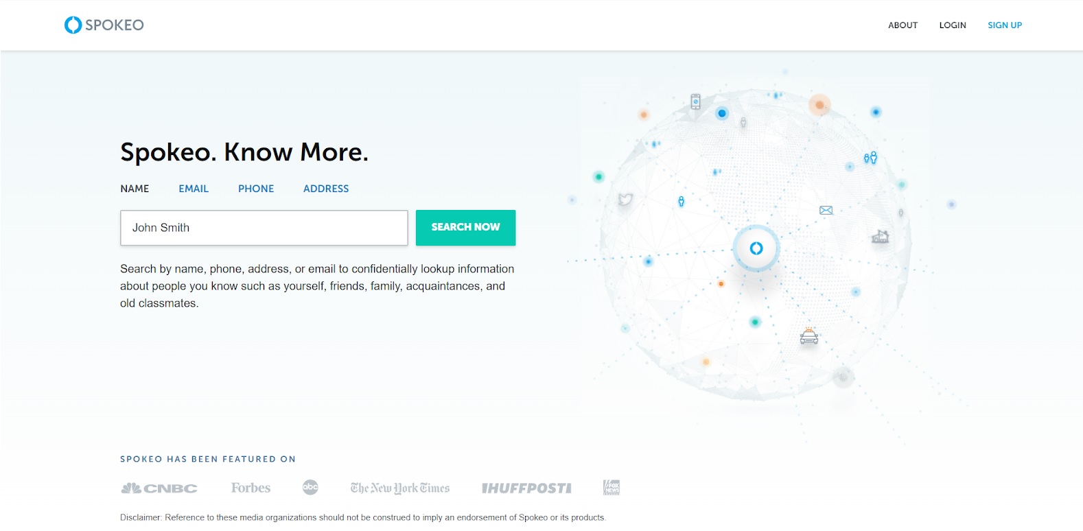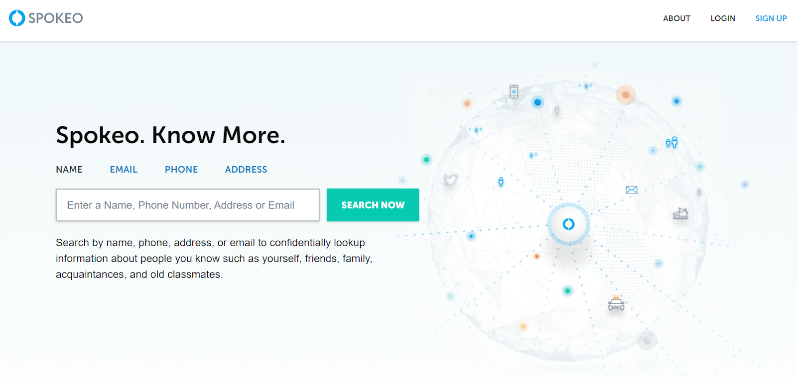 A primeira coisa que você vê ao visitar o site são as quatro opções de pesquisa. Você pode pesquisar dados com base no nome, endereço, número de telefone ou endereço de e-mail. A Spokeo está sediada nos EUA, o que significa que aceita apenas números de telefone registrados nos EUA e todas as informações são limitadas aos Estados Unidos.