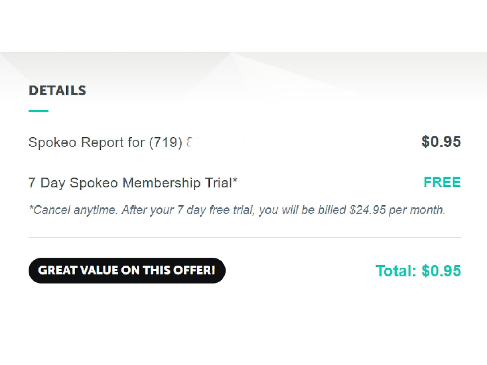 O Spokeo oferece uma avaliação gratuita de 7 dias, além da compra de um único relatório por $0,95. No entanto, você precisa ter cuidado ao se inscrever para o teste gratuito, pois após os 7 dias iniciais, você será cobrado $24,95 se não cancelar. Isso ocorre porque você deve fornecer suas informações de cartão de crédito mesmo ao se inscrever apenas para o teste gratuito.