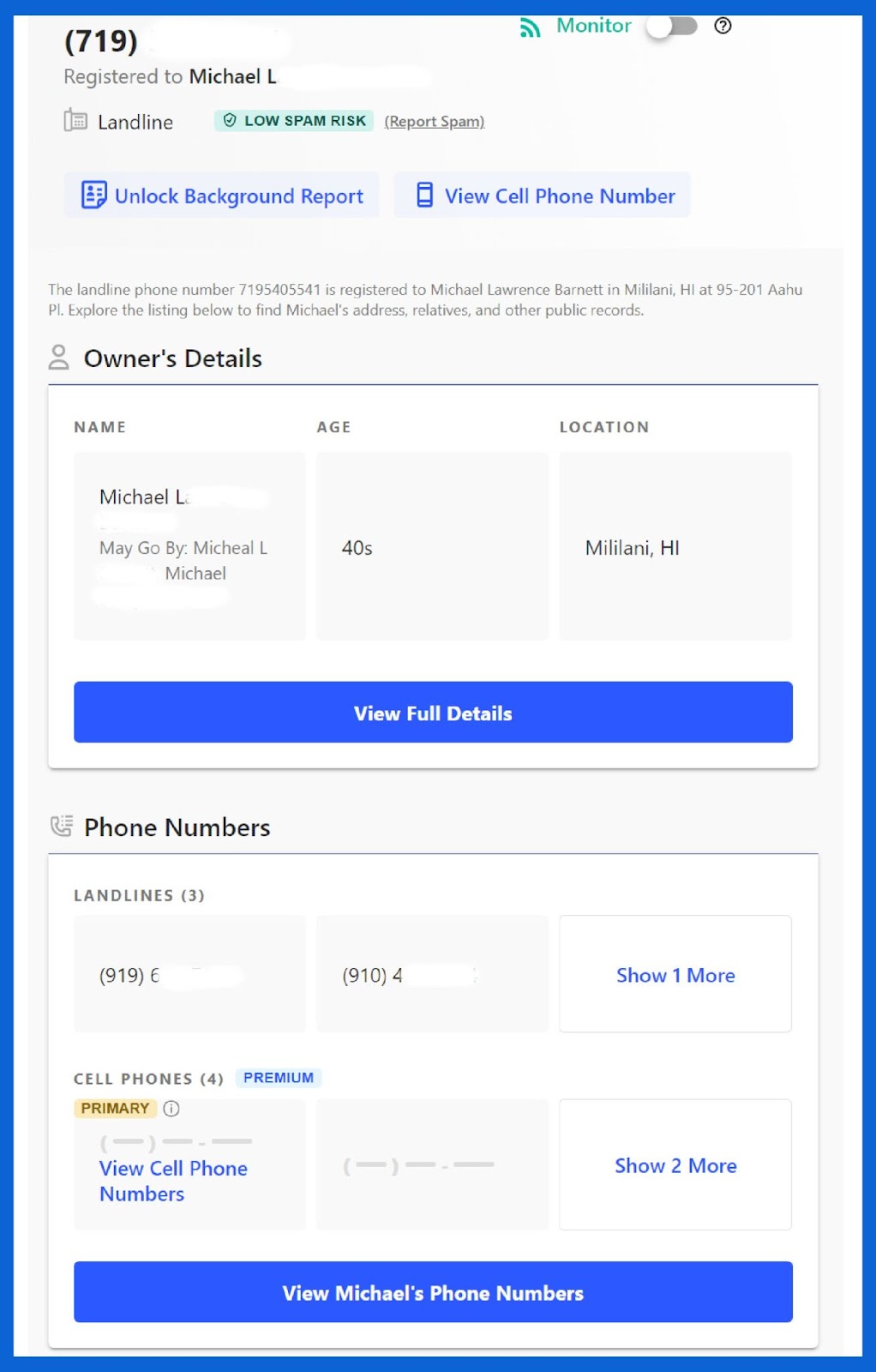 Em alguns casos, o site/aplicativo pode gerar resultados mais detalhados. Nesse caso, você pode ver um nome associado ao número e detalhes como endereço, idade da pessoa, outros números de telefone que possam estar relacionados à mesma pessoa, parentes e muito mais. No entanto, se você precisar de mais informações sobre seus relatórios criminais e de antecedentes, eles estarão disponíveis mediante o pagamento de uma taxa adicional.