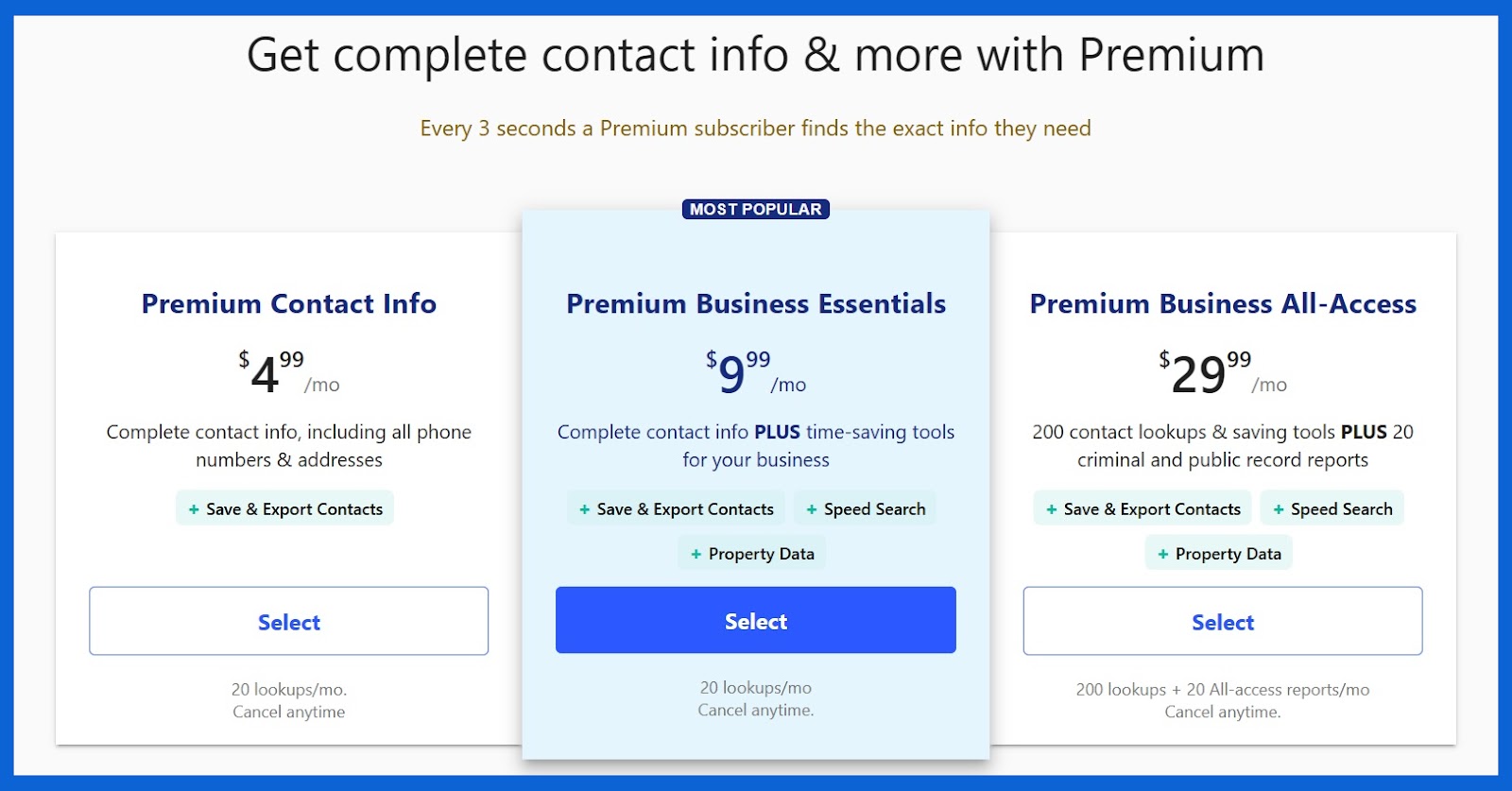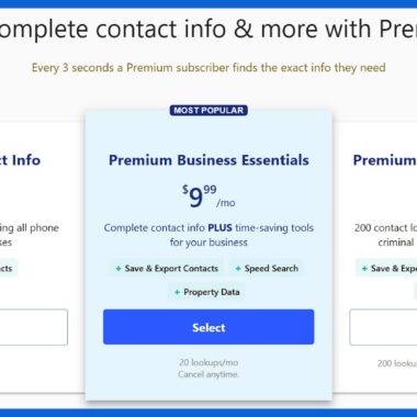 O terceiro plano de assinatura custa $29,99/mês e inclui até 200 consultas por mês, 20 relatórios criminais e públicos, e todos os outros recursos incluídos no Premium Business Essentials. Como nos outros planos, você pode pagar mensalmente ou anualmente, o que equivale a $179,88 e corresponde a $14,99/mês.