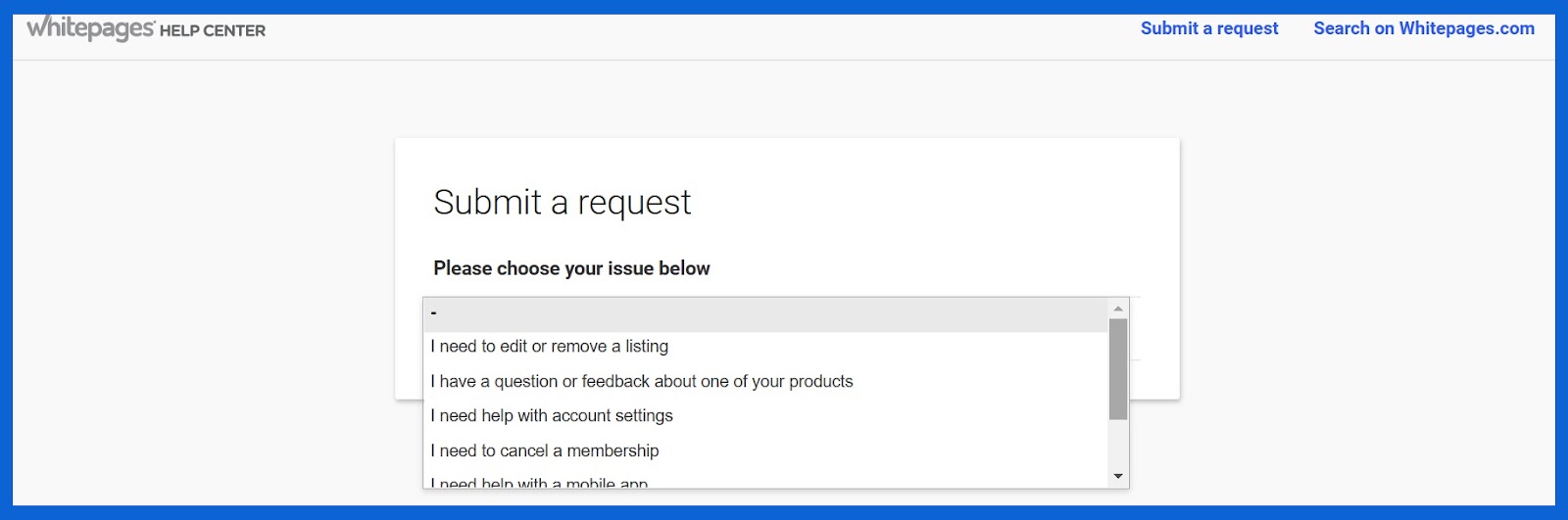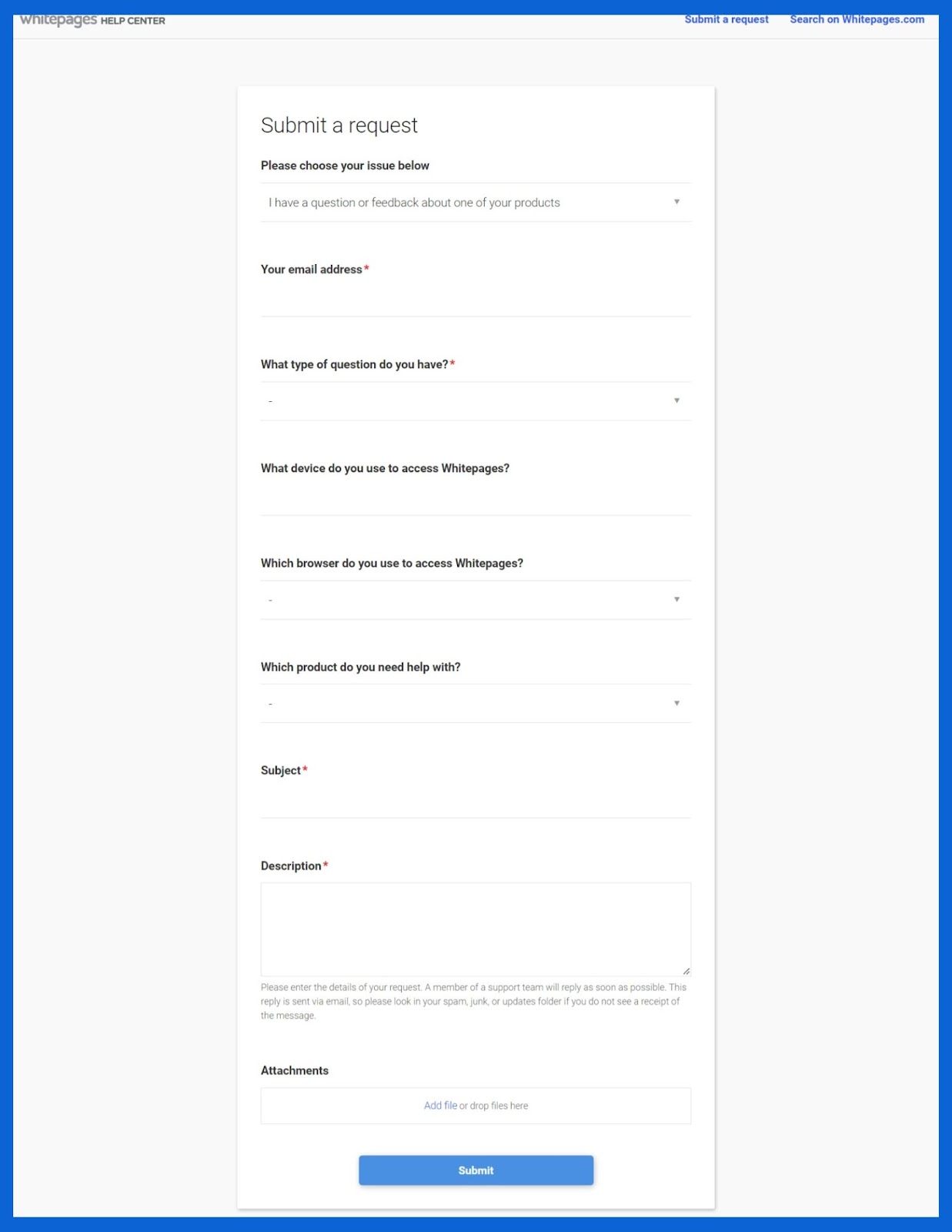 Você pode entrar em contato com o suporte ao cliente da Whitepages preenchendo um formulário de solicitação em seu site. Eles não oferecem chat ao vivo ou suporte instantâneo ao cliente.