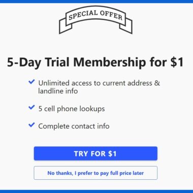 Whitepages também oferece uma assinatura experimental de 5 dias por $1, que permite acesso ilimitado a informações como endereço atual e informações de telefone fixo. A assinatura experimental não inclui recursos adicionais. Inclui apenas 5 consultas de telefone celular reverso, o que não dá muito espaço para testar seus serviços.